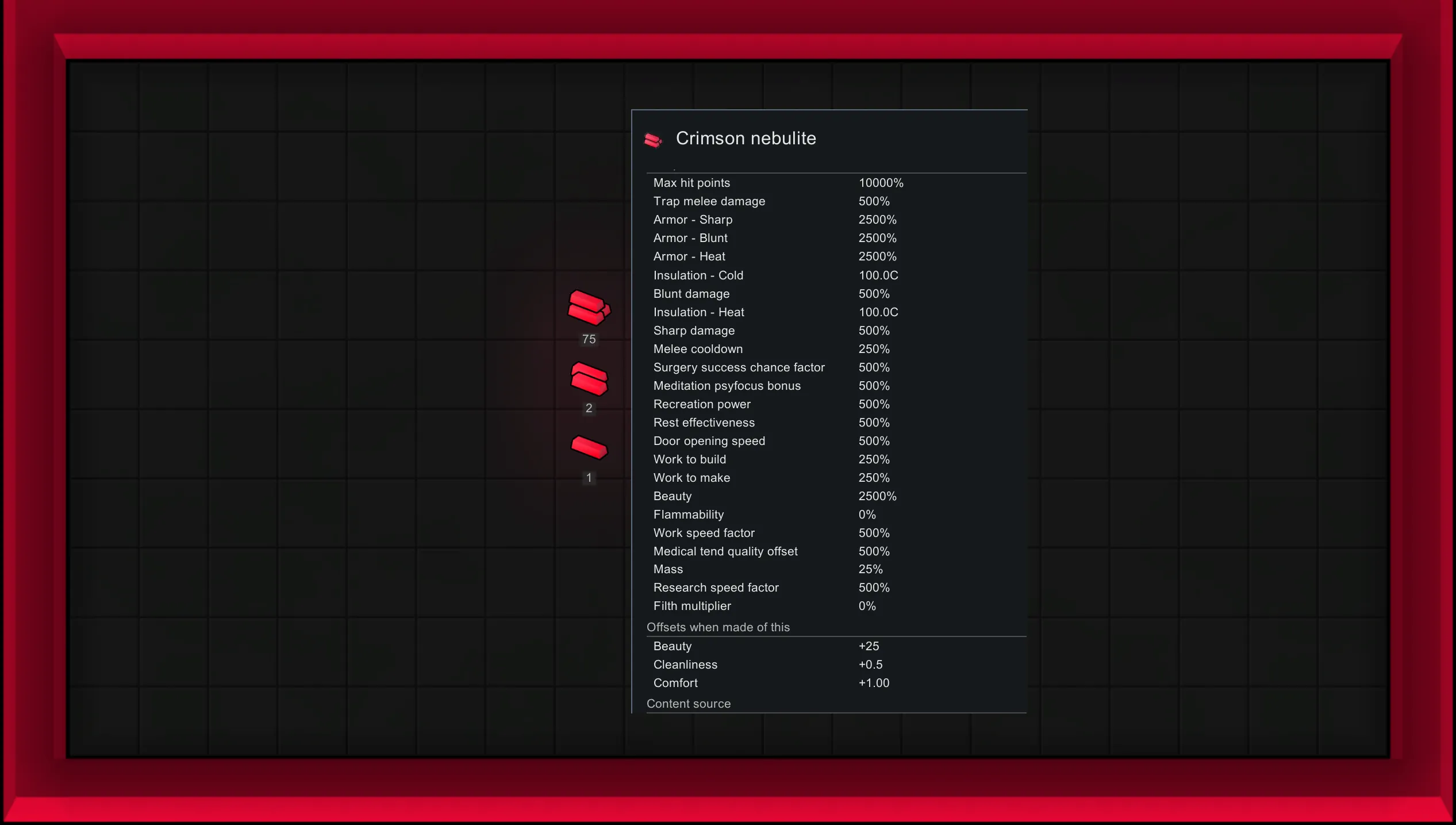[*] Material: Crimson nebulite. An extremely strong material with the purpose of being versatile. It counts as all material types: Stone, Wood, Metal, Cloth and Leather.