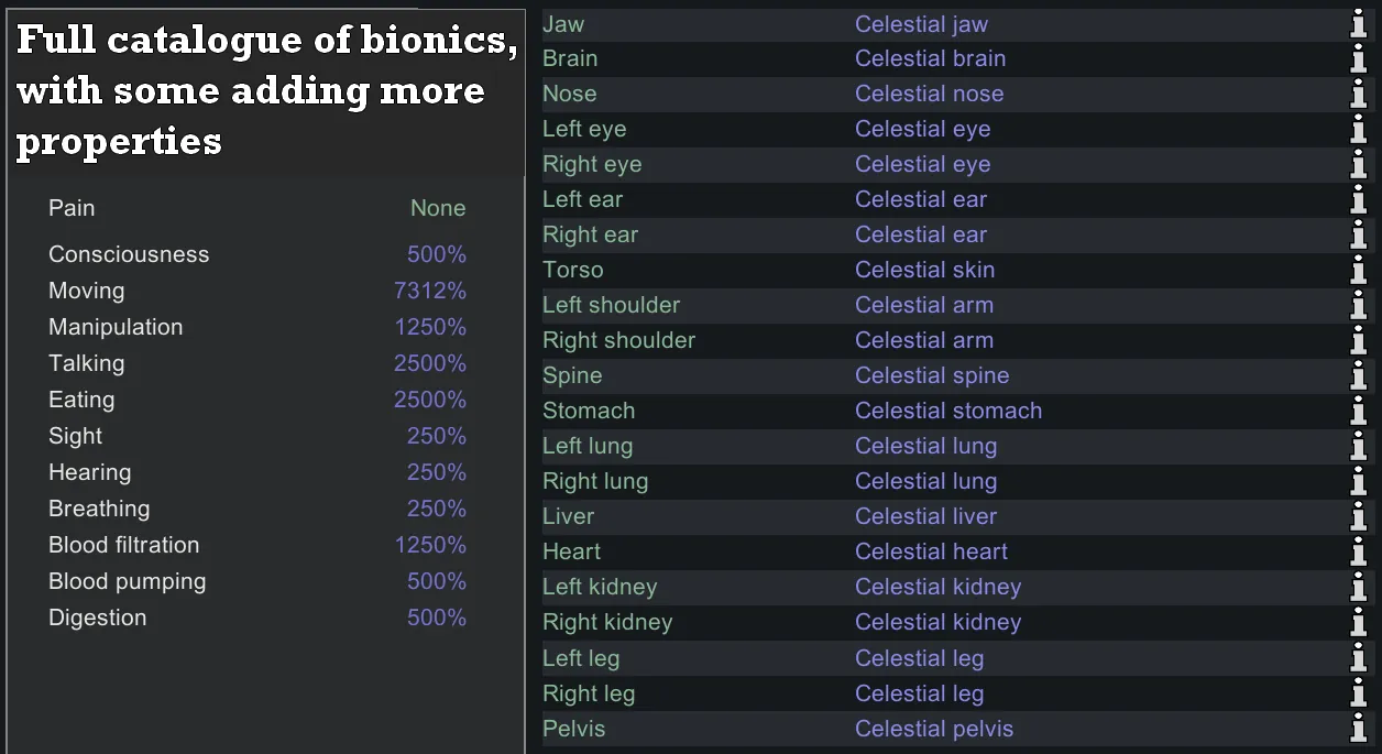A full suite of bionics, with some having special properties. The details on what each does is down below.