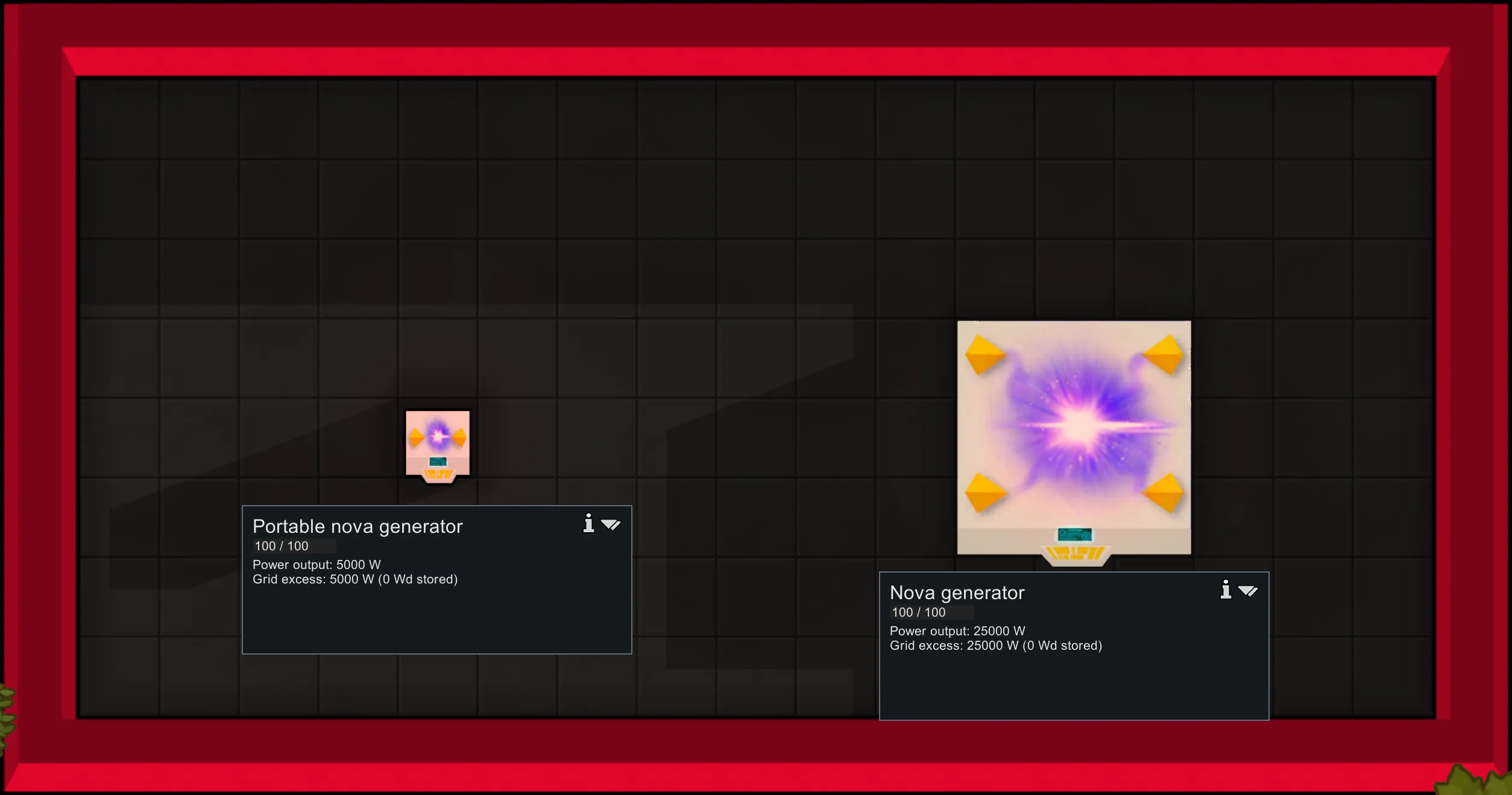 A smaller version of the Nova Generator that produces 5k power with a risk of causing a smaller (10 tiles) but still devastating explosion if damaged.