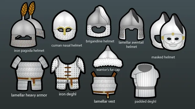 [b]Helmets:[/b] lamellar aventail helmet, brigandine helmet, masked helmet, iron pagoda helmet, warrior fur cap