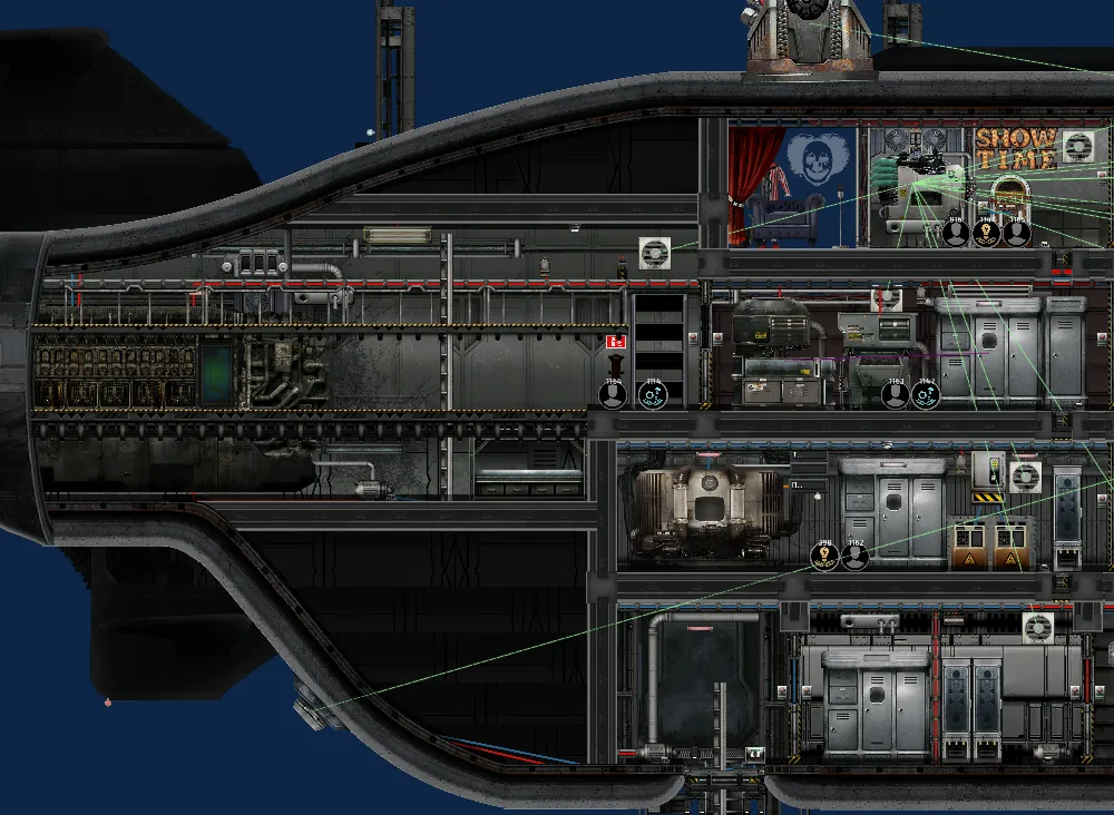 Engine compartment: the oxygen generator has been moved to a smaller room — now a perfect space for your clown friend to live in, listen to music, and share it with the rest of the crew. To create more space inside the engine area, an additional platform has been installed, with a bit more room added underneath. And of course, a bunk bed has been placed under the platform for your hard‑working mechanic.