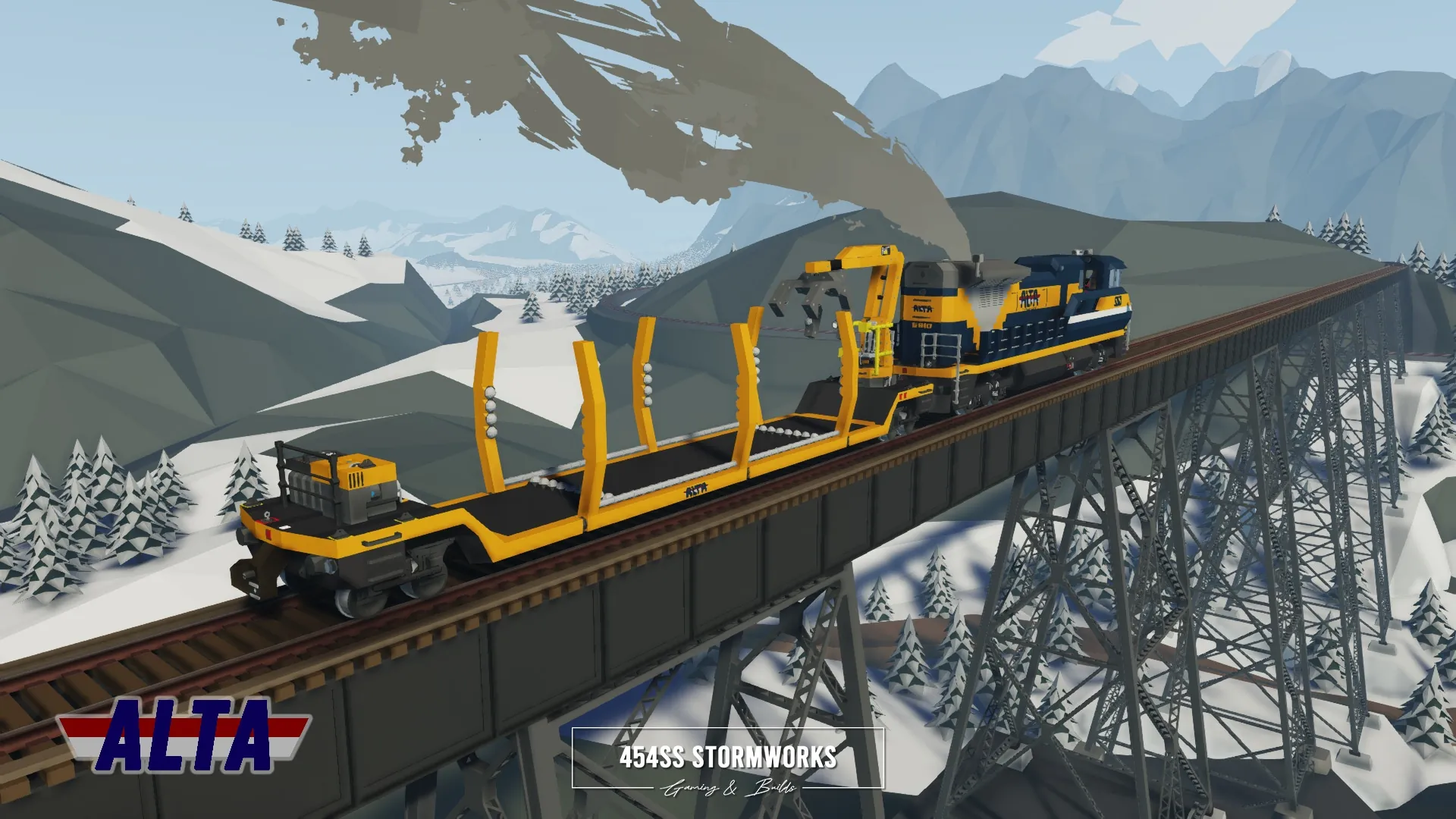 Logging railcar with crane and generator, owned by ALTA Corp. For full functionality, the locomotive must be RCU Standard Compatible.