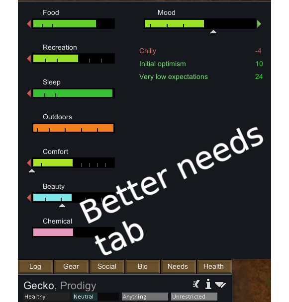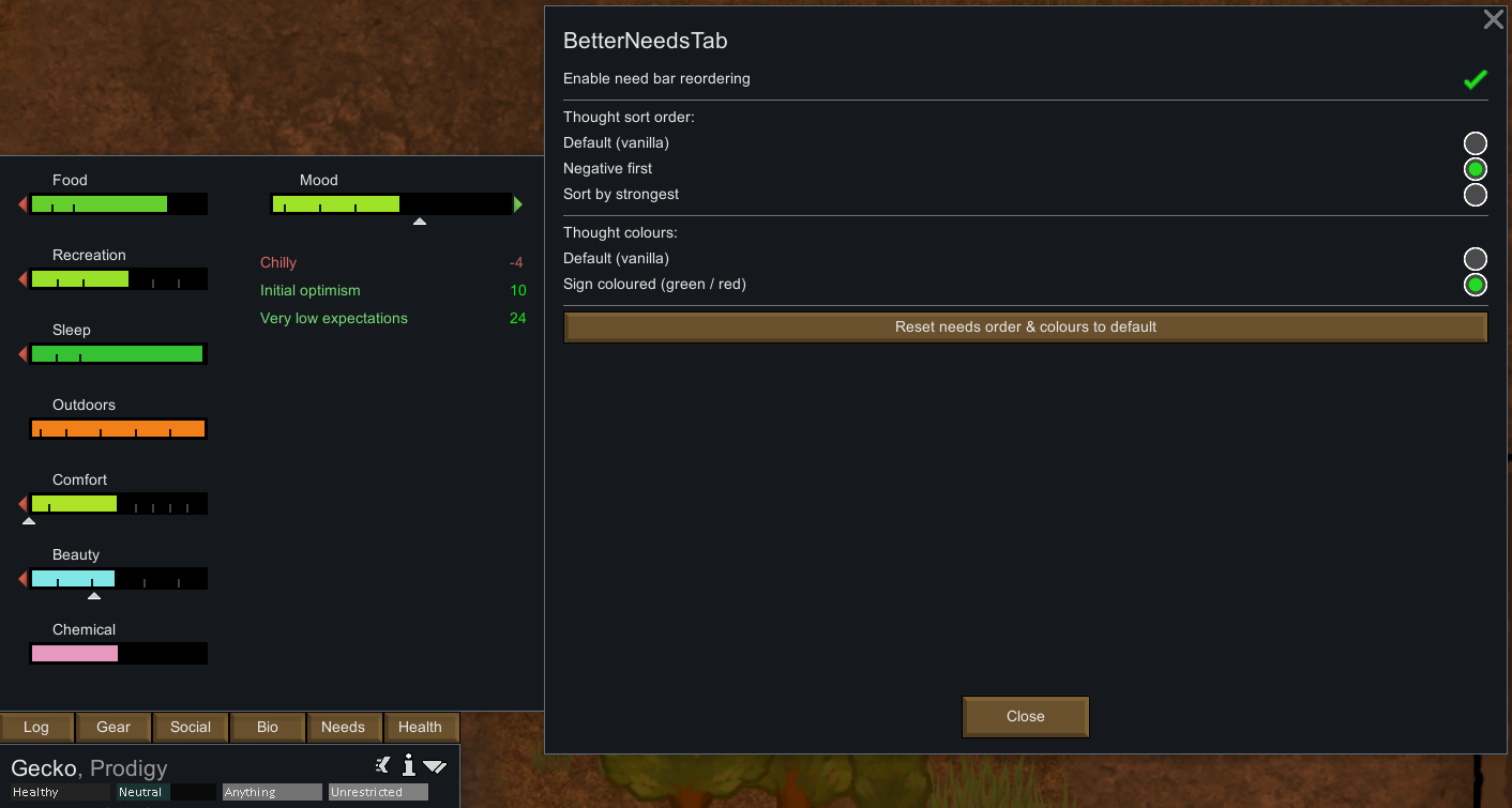 - Open Options > Mod Settings > BetterNeedsTab to configure thought sorting, thought colours or to reset everything to vanilla defaults.
