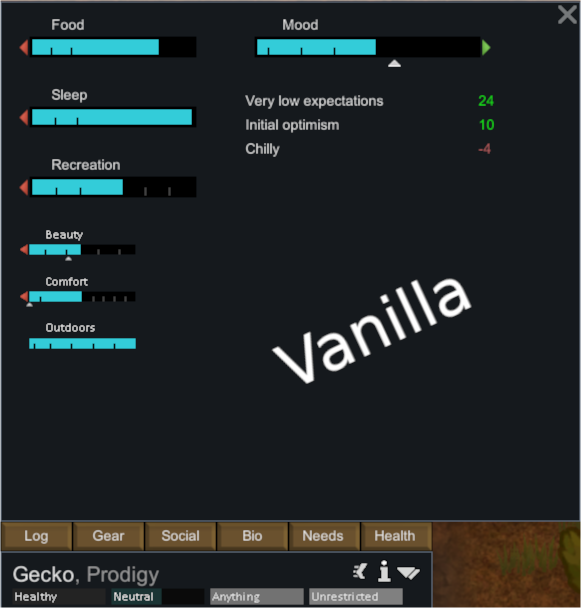 Take full control of the Needs tab for every type of pawn. Reorder need bars exactly the way you want - separately for colonists, slaves, prisoners, animals, mechanoids, entities and drones - give them custom colours per pawn type and sort mood thoughts to find problems at a glance. Every setting is saved persistently and fully restored on load.