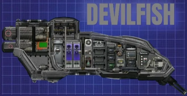 The Devilfish is a fast recon and transport shuttle. It is produced by the Europa Coalition, but some mysteries surround the development of the ship. Little is known, and some even say that the original blueprints might have come from an alien ruin far down in the abyss.