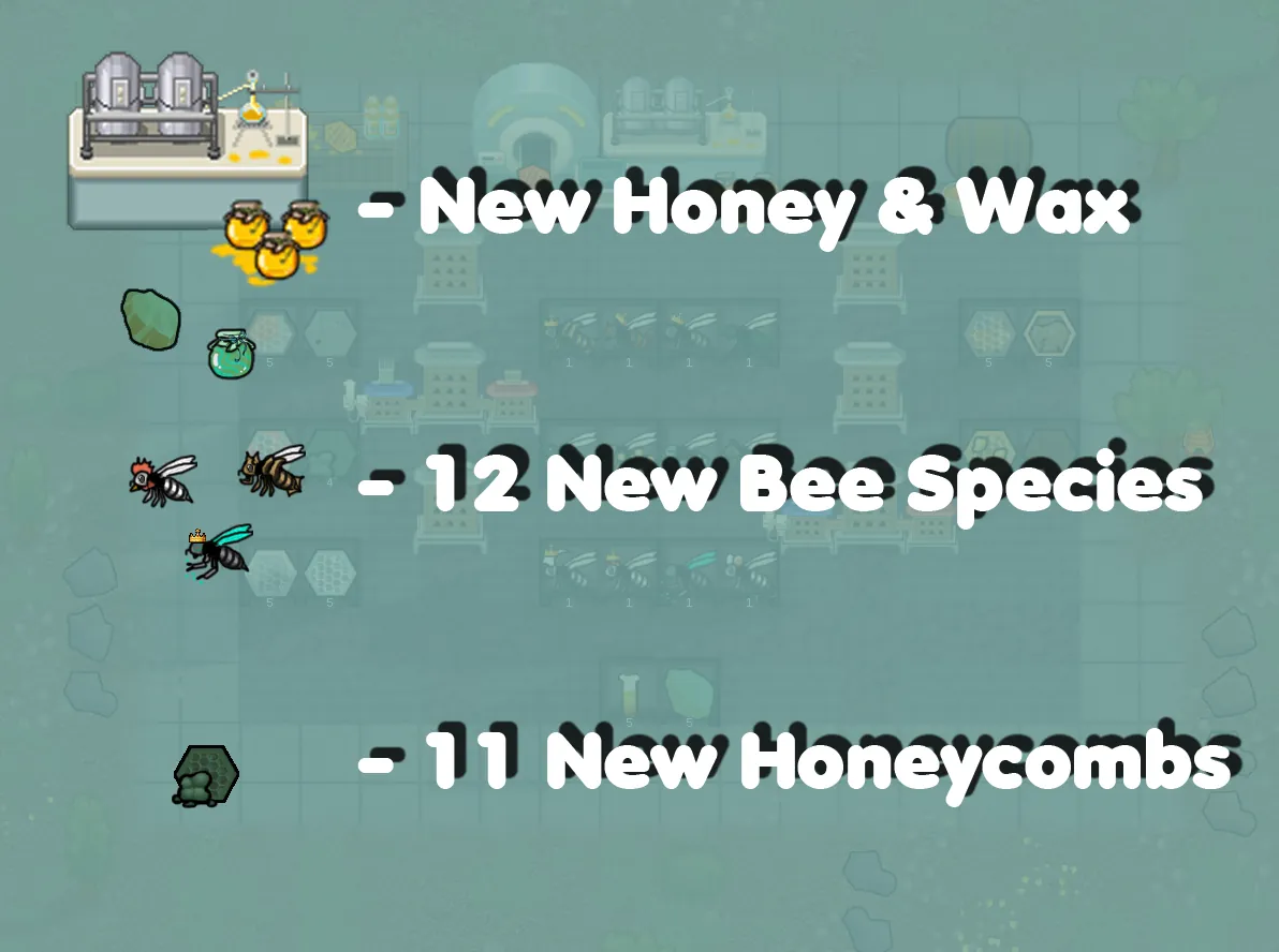 - Adds twelve new bee species that generate materials for Genetic Rim, as well as the reserach to discover new combinations!