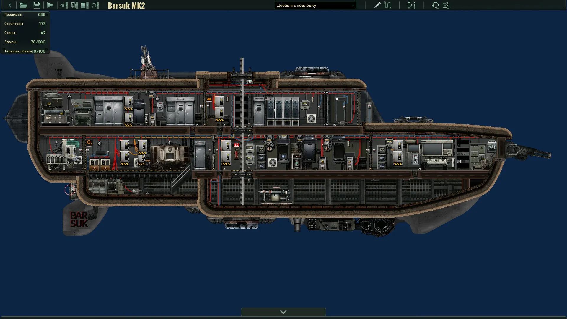 "Барсук МК2" -- Является Продолжением ветки Барсуков. В этой модификации поставили фабрикатор, деконструктор и разрядную катушку а также заменили переднюю лазерную турель на цепную пушку и установили два больших держателя сверху и снизу. Так что этот Барсук вам наверное понравится (или нет я незнаю). Удачи в вашем плаванье к оку Европы!