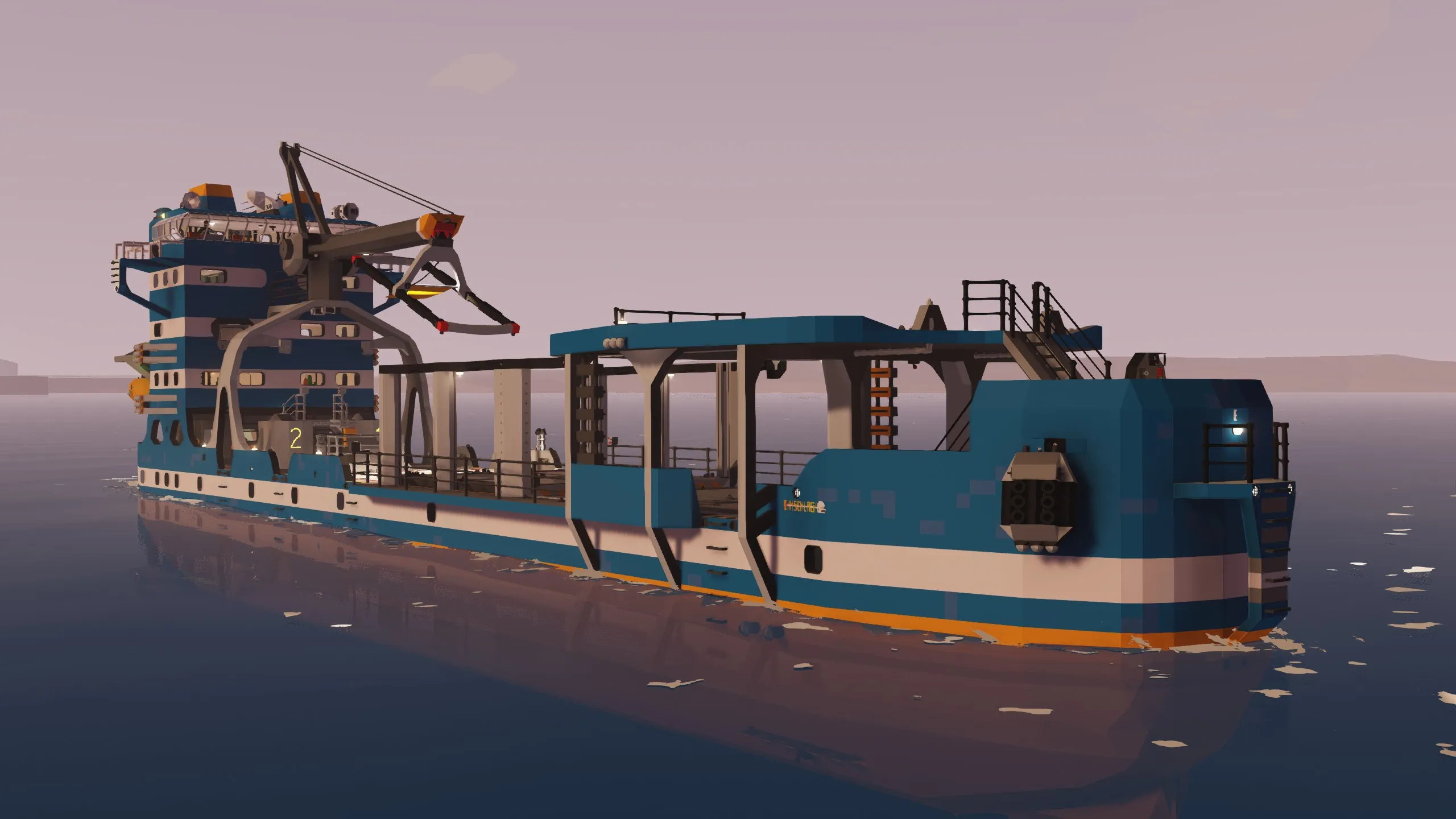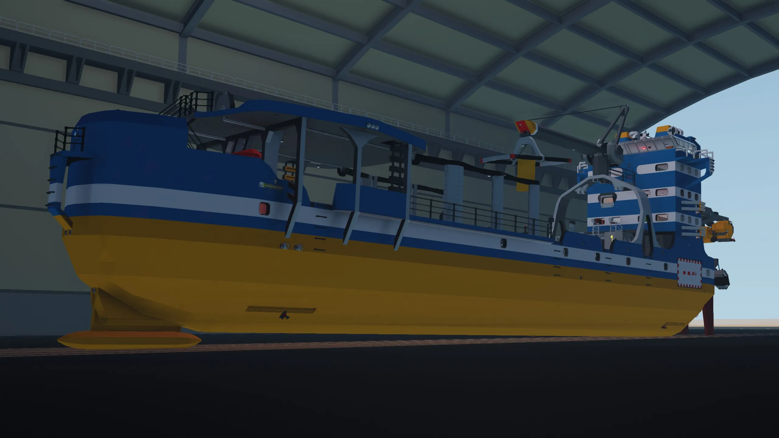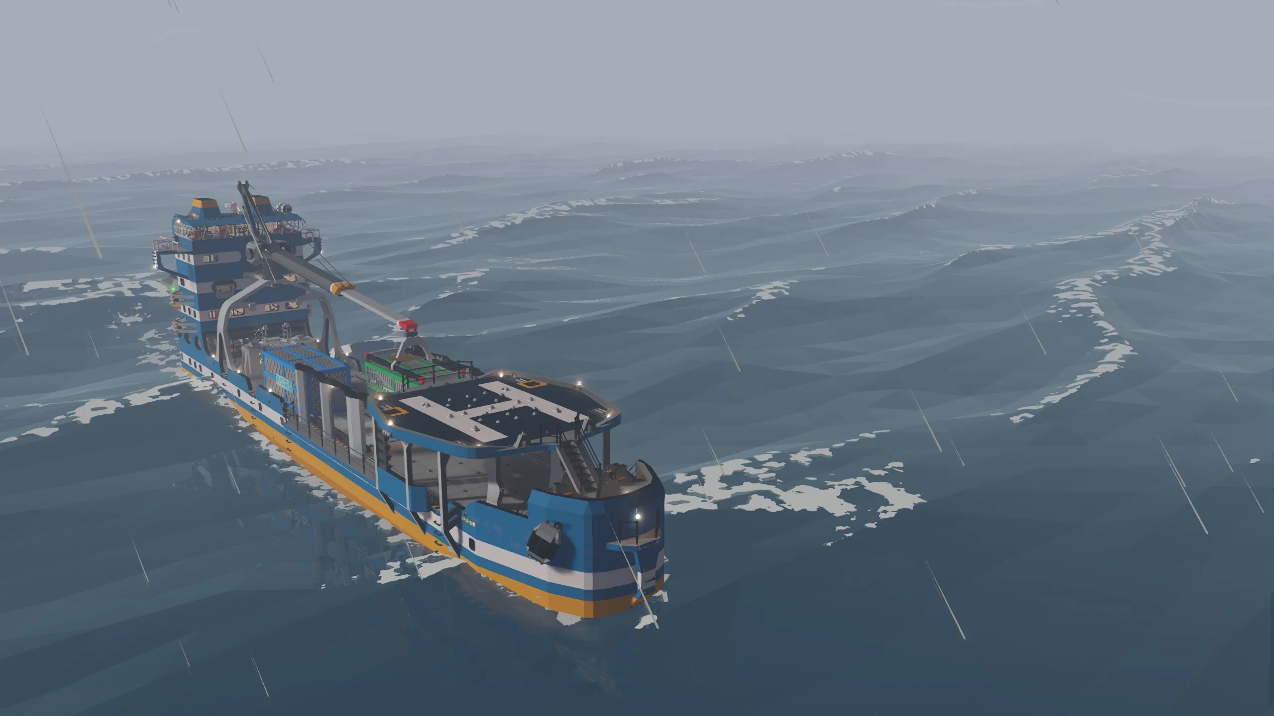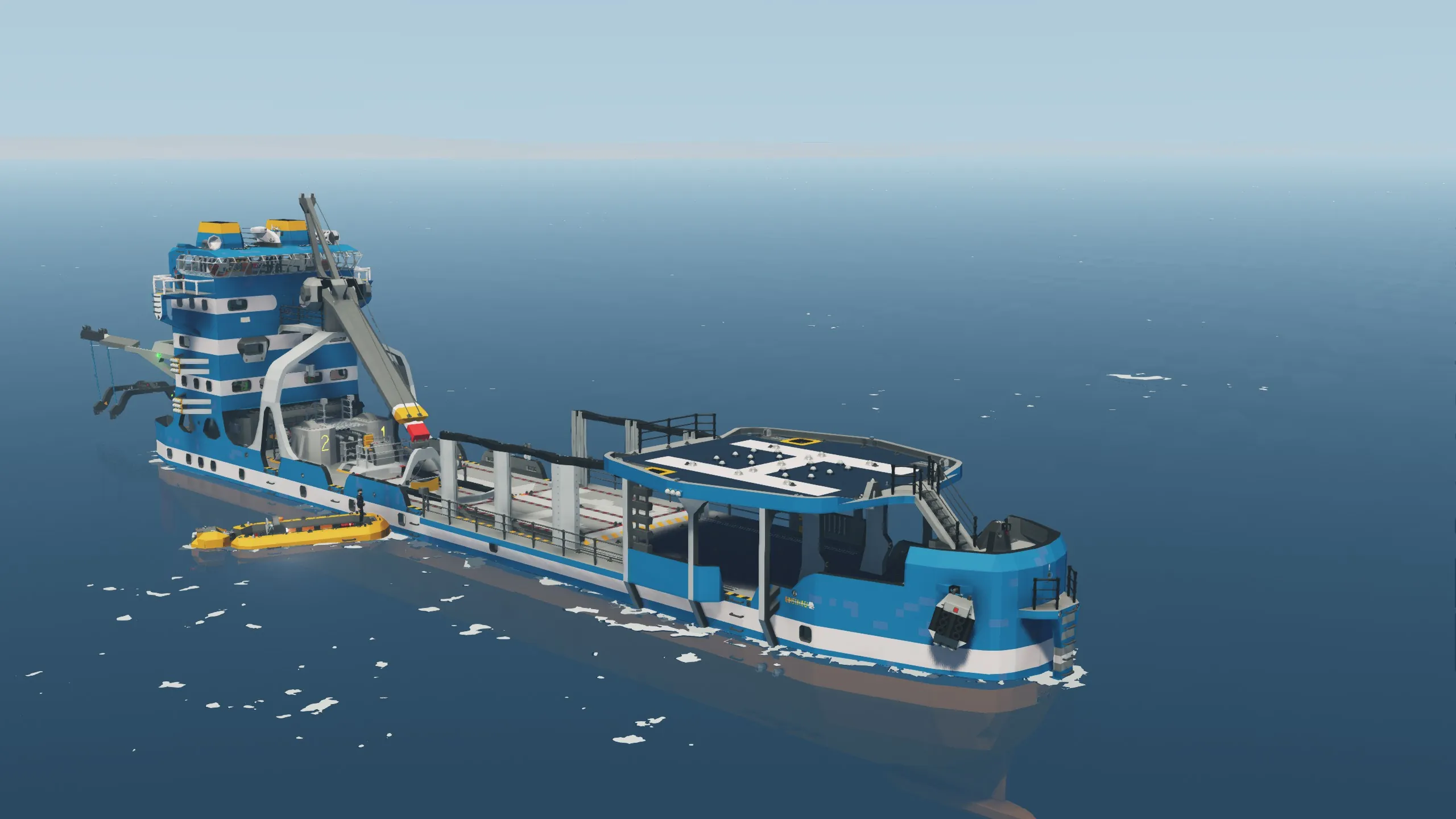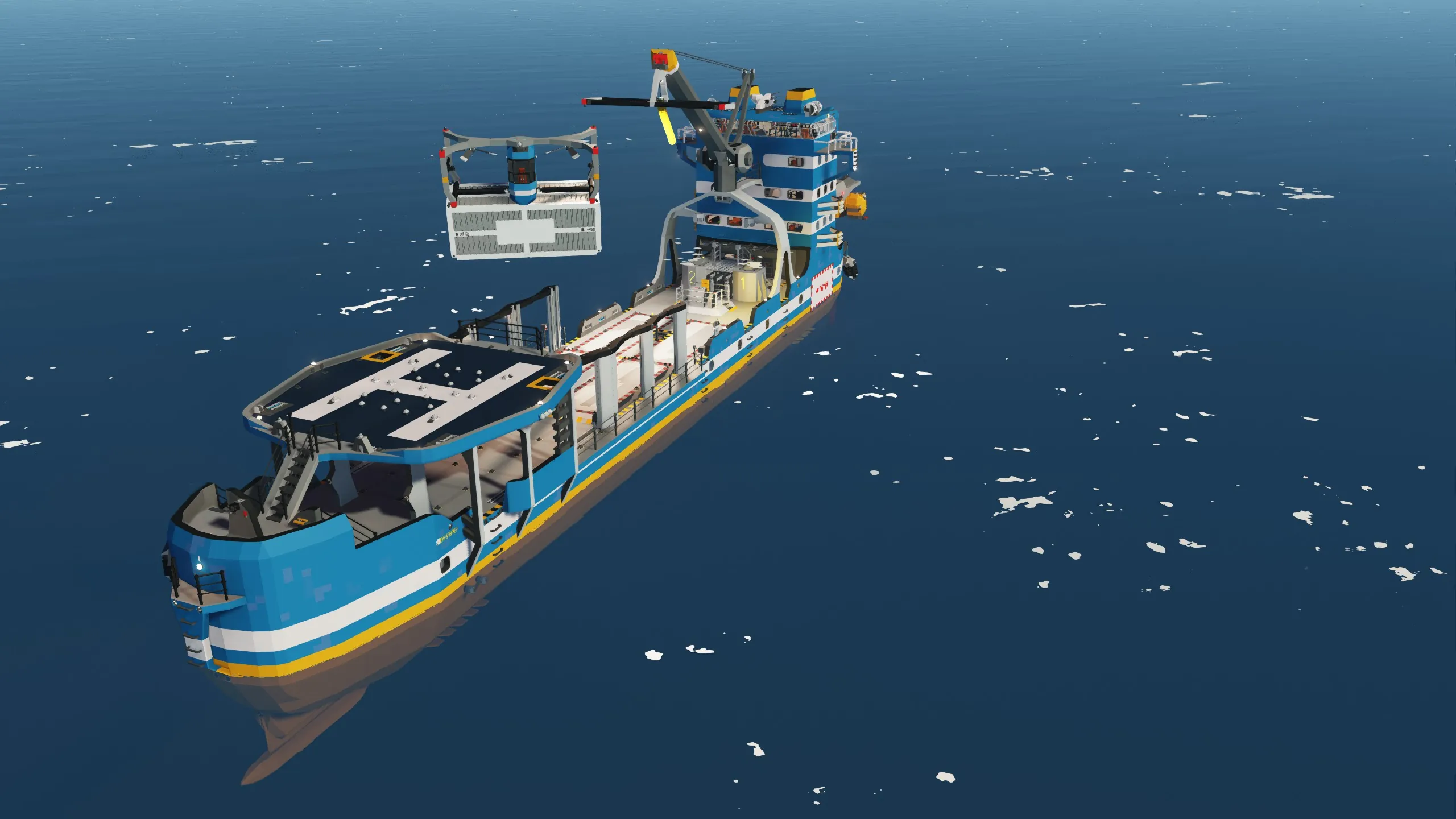 The Beluga Freighter is a versatile nuclear powered vessel built for container transport and cargo operations. With a helipad, plenty of equipment and redundancy in mind, it is suited for container transport as well as rescue and exploration operations. Featuring two independent reactors, advanced navigation systems, and comfortable crew accommodations, this vessel ensures safe and efficient operations in any climate while providing all the amenities needed for extended voyages at sea.