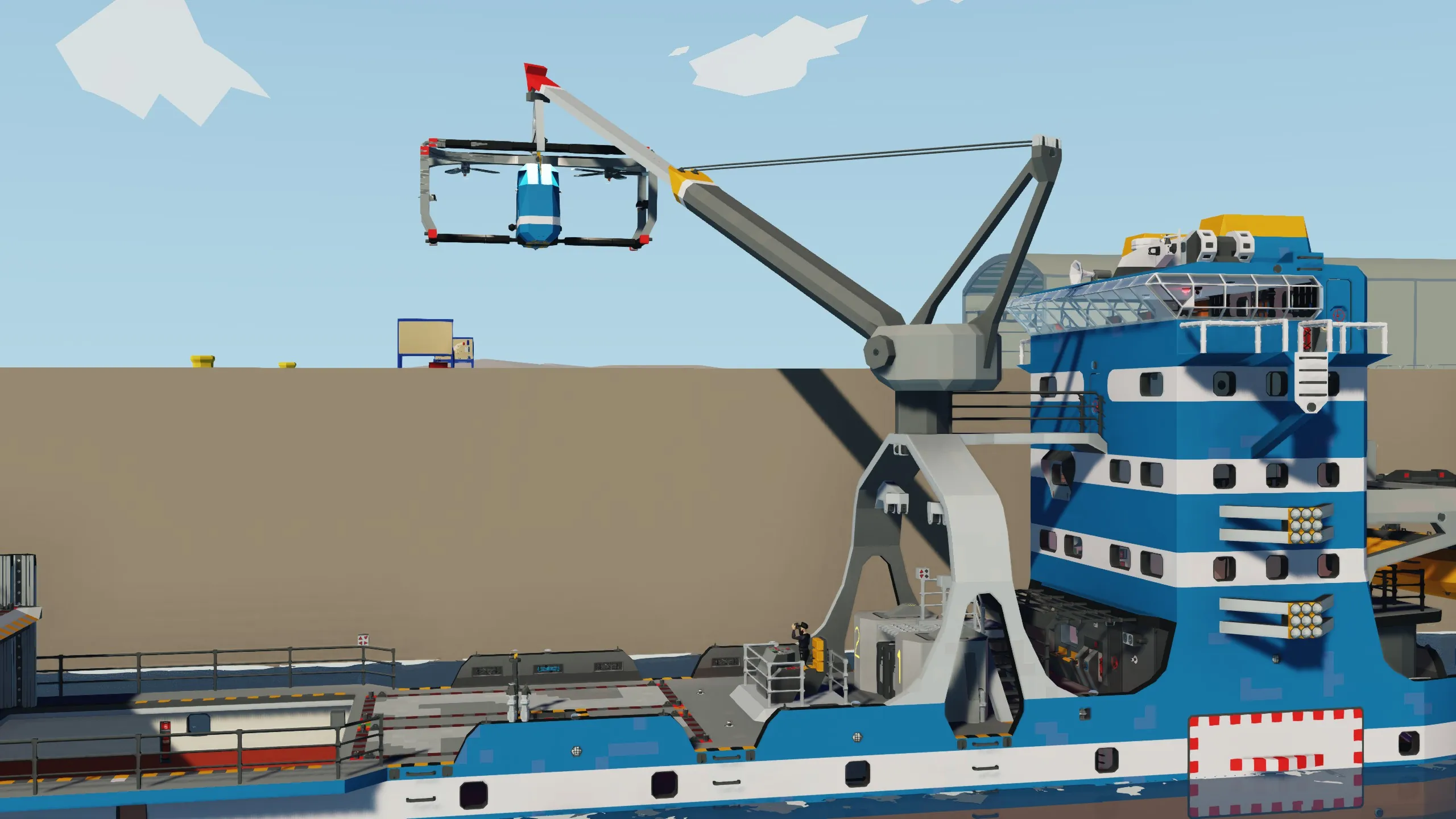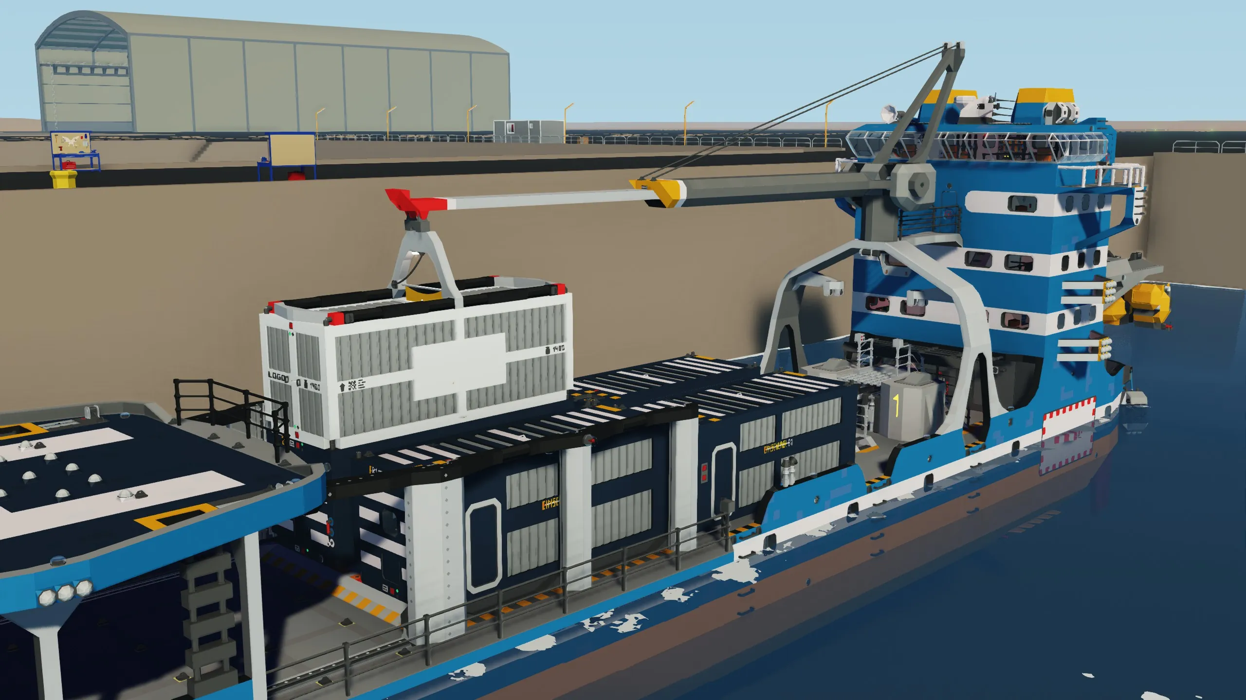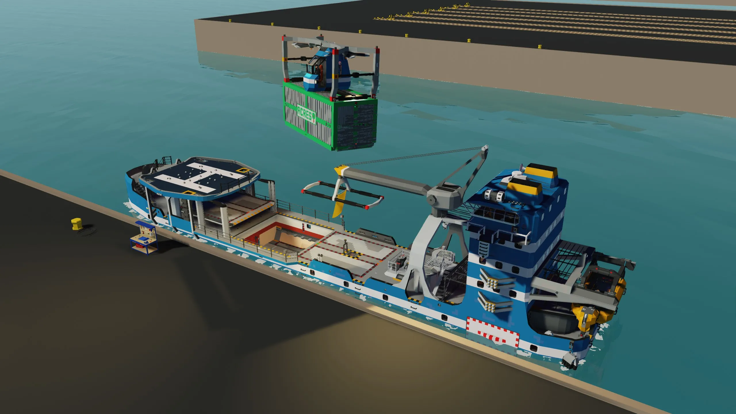 - Remote control operation capability (for ship and crane movement)