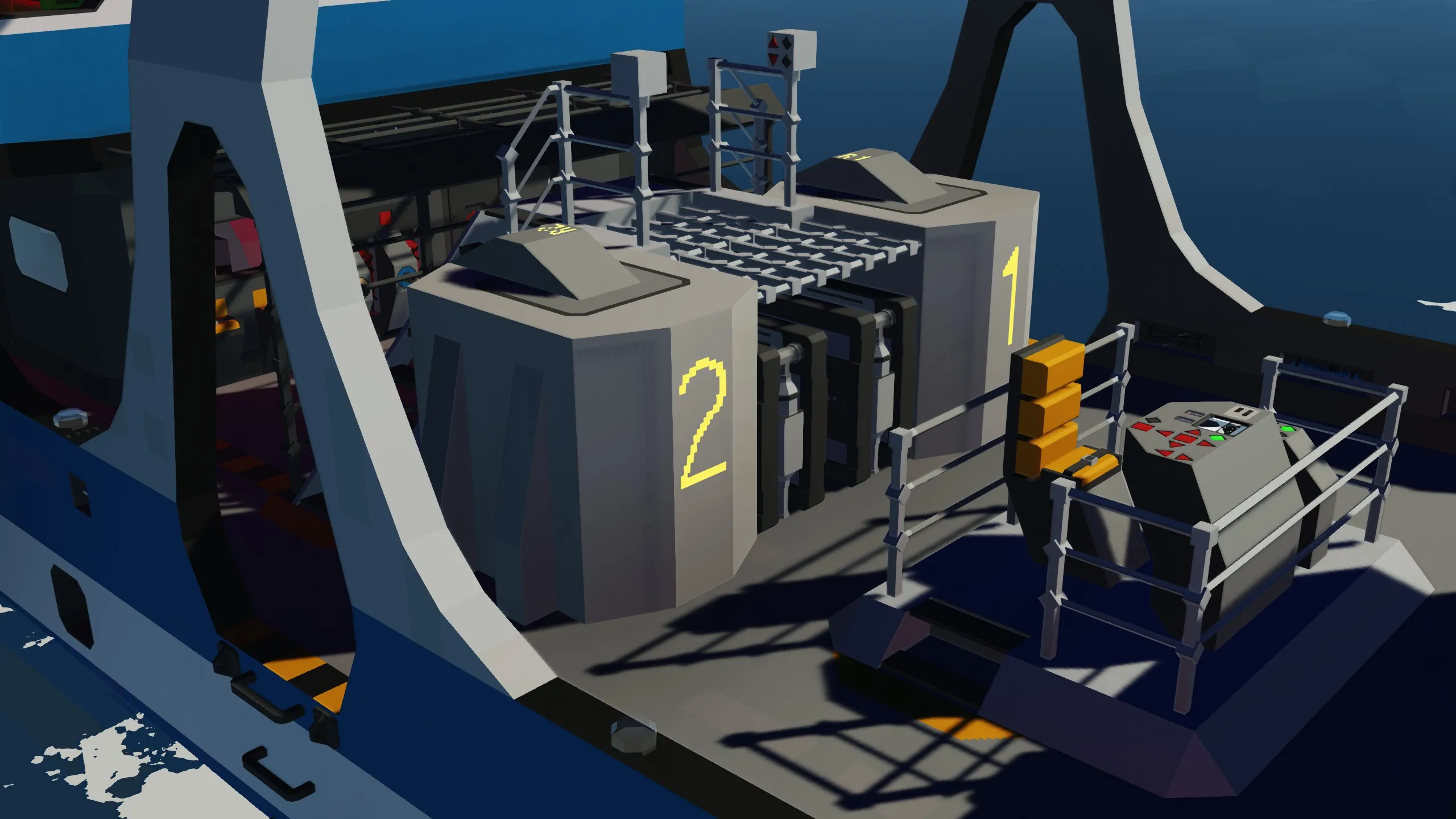 Tip: There is a remote control station on top of the forecastle that can be used to remote control fuel gantries on the dock (the remote control frequency is shown on the gantry). Lower the gantry and connect it e.g. to the fluid connectors on the helipad.