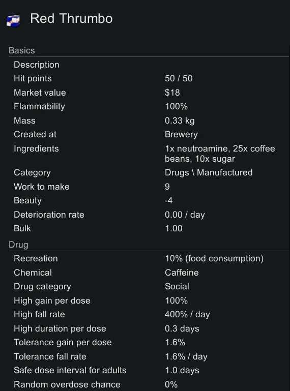 This mod serves as a grounded less intense/addictive version of go-juice that'll make your colonists work and think faster for a limited time (6 in-game hours). Perfect for Industrial based runs. Also just looks cool. The Fridge itself while intended for the drink can be used to store other foods/drinks and will keep your items cold and mold free!