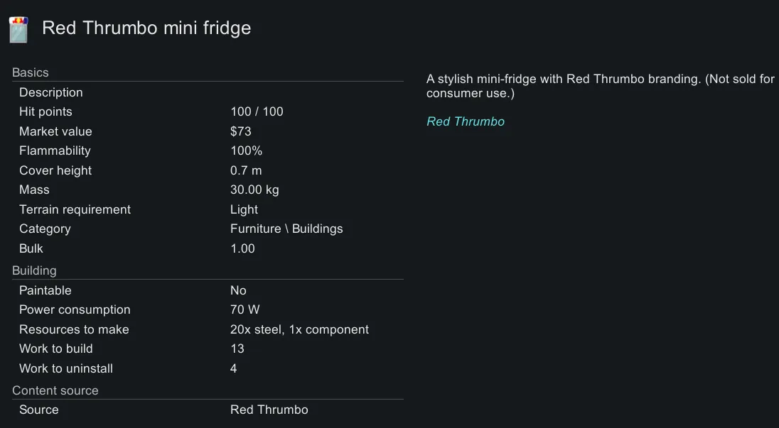 Adds a 'Red Thrumbo' energy drink, and a bar fridge to go with it.