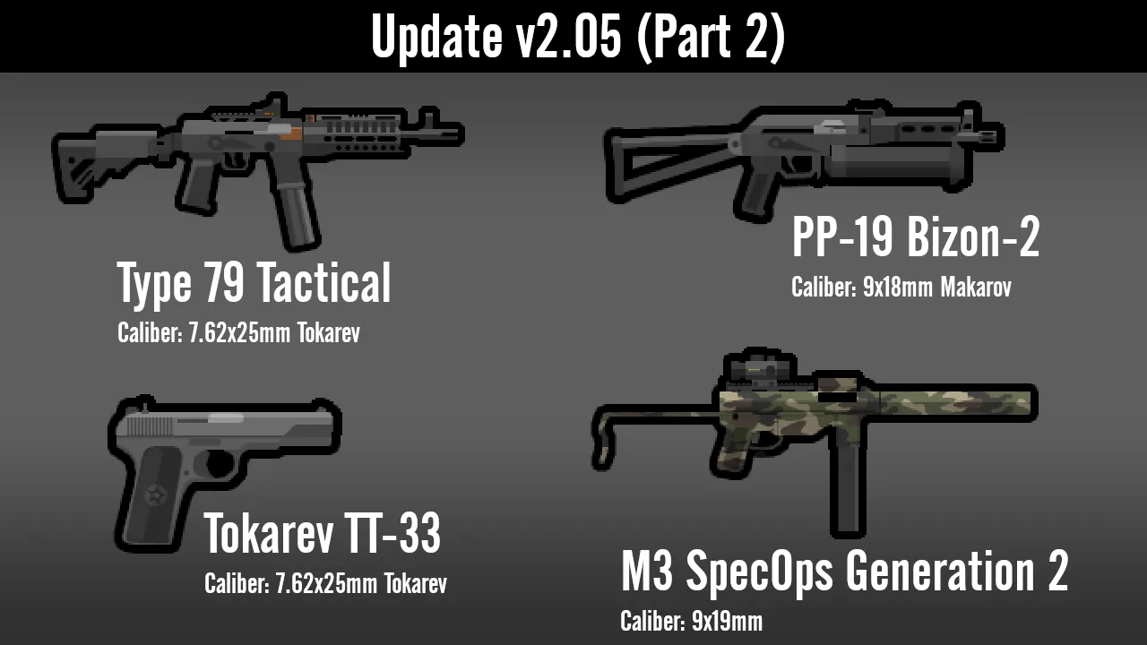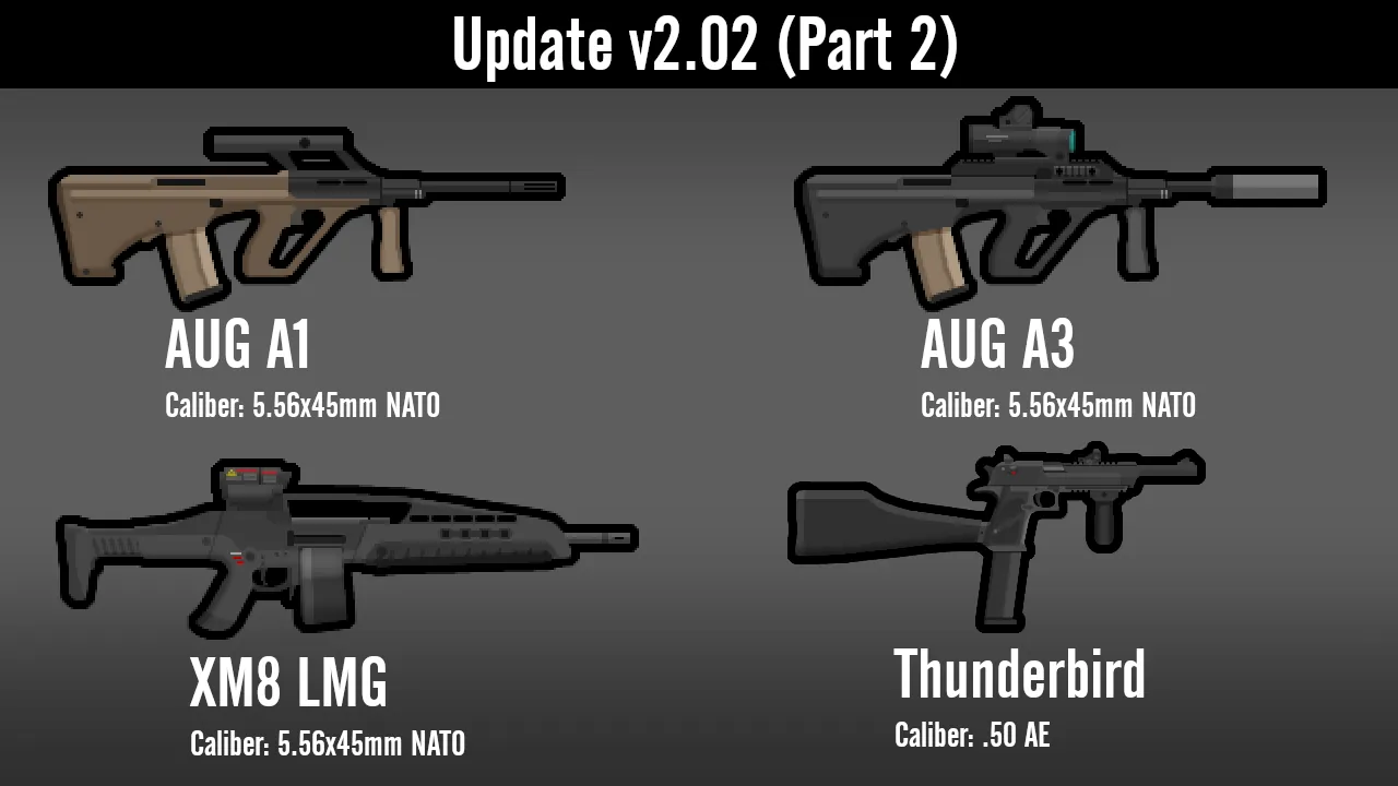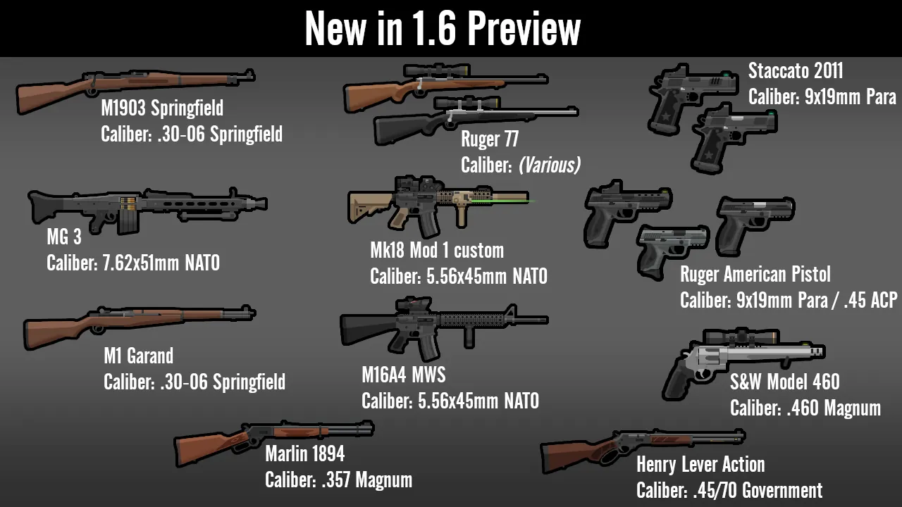 The calibers being listed in the screenshots is for CE users, but it also shows a good idea of how much damage they do. Note that certain weapons may appear too small or too large, as this was made with CE in mind which has its own weapon rendering system.