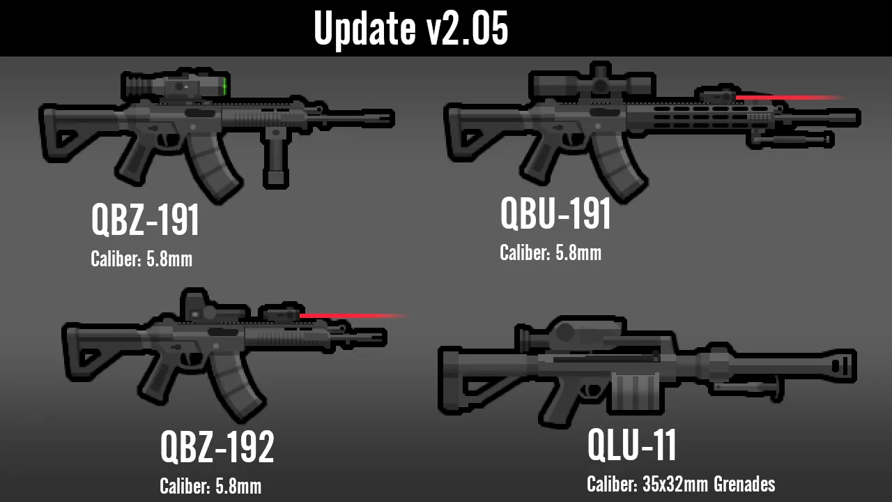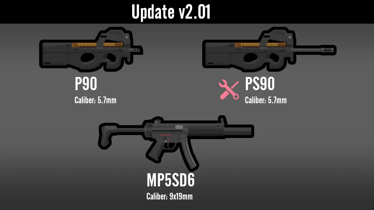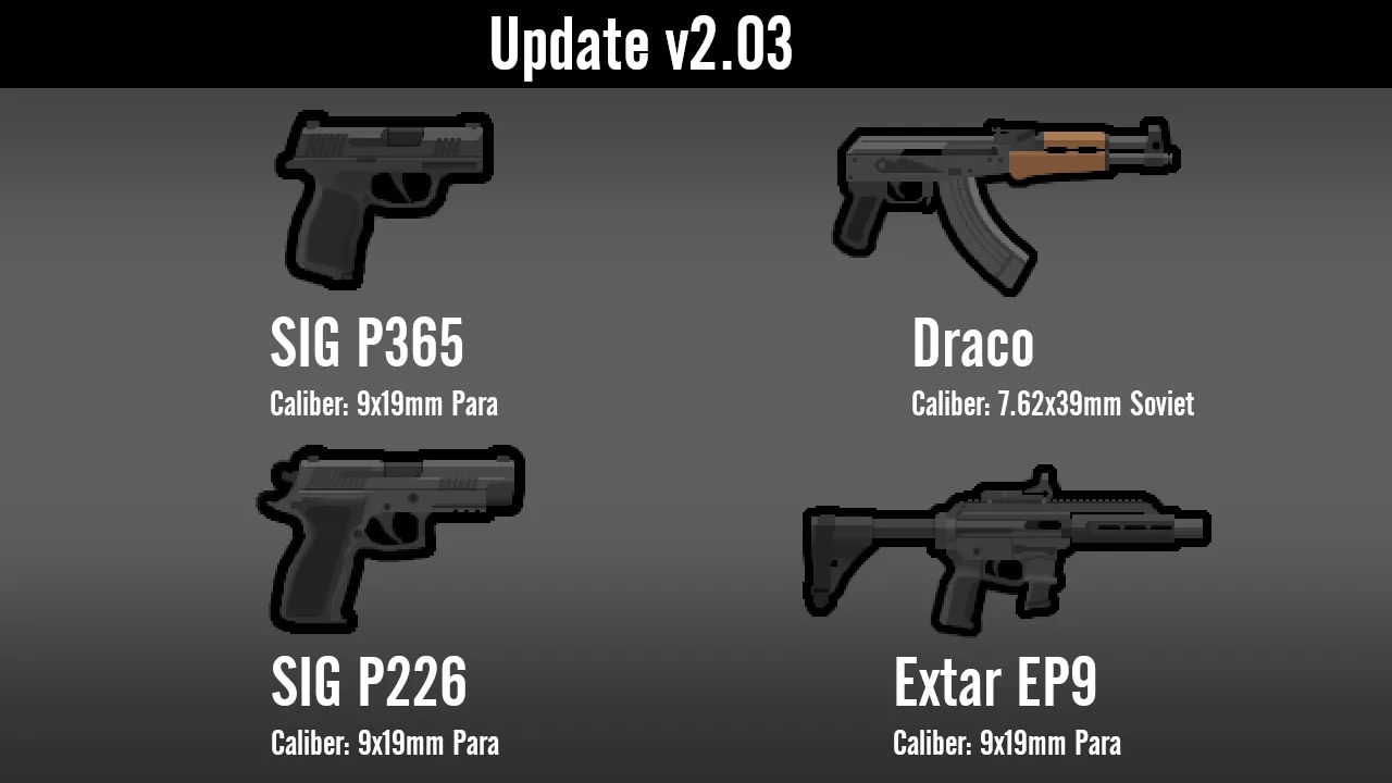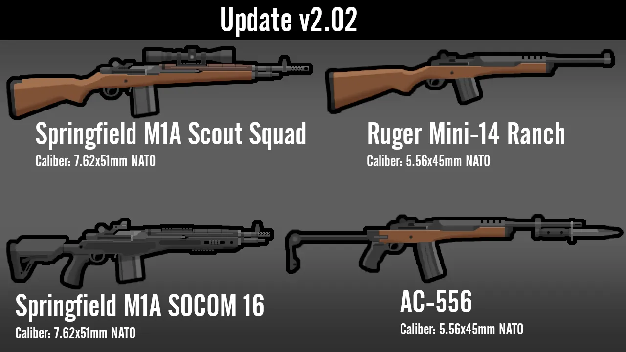 The calibers being listed in the screenshots is for CE users, but it also shows a good idea of how much damage they do. Note that certain weapons may appear too small or too large, as this was made with CE in mind which has its own weapon rendering system.