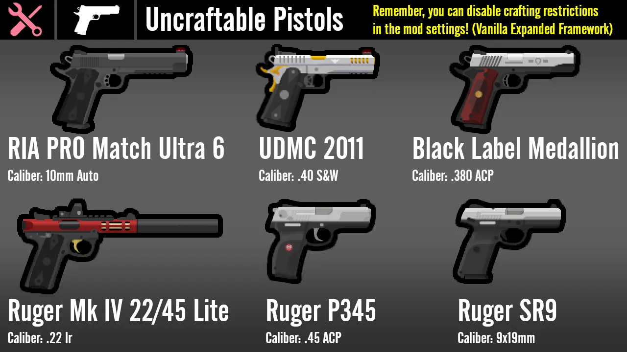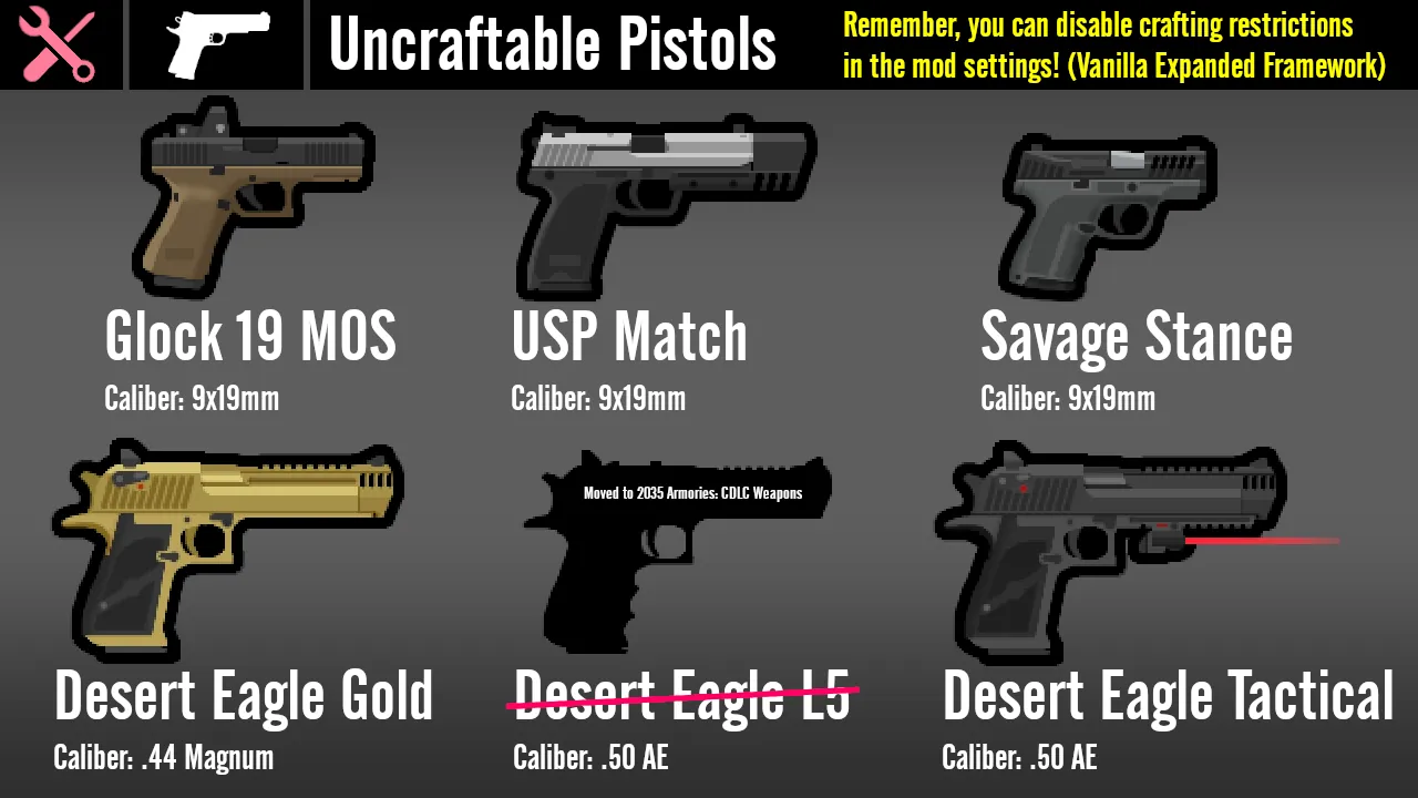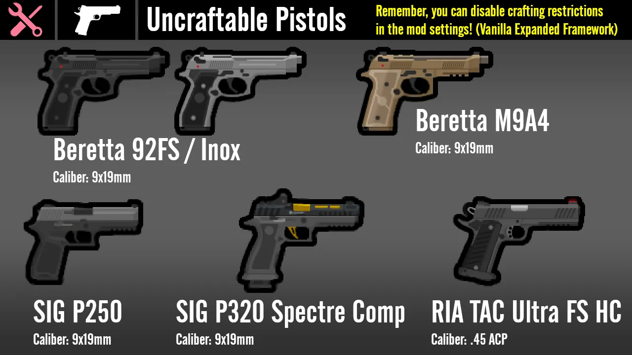 A: In order to cut down on taking up menu space, certain weapons which are simply cosmetic variants of the same gun or have extremely similar stats can only be found through trade or used by raiders. This also applies to civilian (semi-auto) variants of guns, weapons which simply would be extremely overpowered if they could be crafted for low cost, or weapons which aren't particularly useful in combat but could be fun to collect and spice up the typical raider loadout. With Vanilla Expanded Framework installed, you can remove these restrictions and make any gun you want by visiting the mod settings.