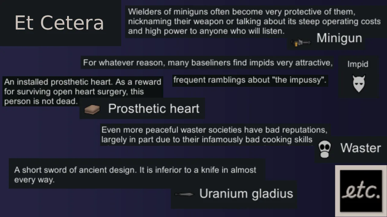 A spiritual sucessor to [url=https://steamcommunity.com/sharedfiles/filedetails/?id=2923745916] Verbose [/url] by It's Pheonix, with some DLC integration. Hopefully now descriptions will be more useful, accurate, or entertaining. This mod is a little less silly than Verbose, but I hope it at least delivers on being useful.