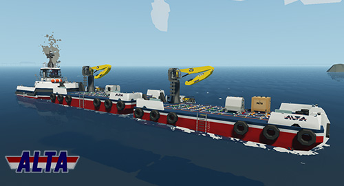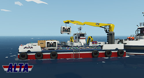 The ALTA CT-01 is a cargo transport barge operated by ALTA Industrial Corp., a company specializing in mining, oil drilling and transportation. The deck can hold up to 2 ISO containers, 4 R10, or 12 UniCon containers.