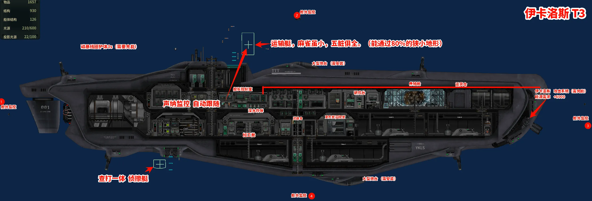该舰搭载的伊卡洛斯级主炮,足以短时间内融化一切物体,但在装载时会对能源产生极大需求,且需要长时间装填(请在危急时刻使用)。 此外,舰体搭载了小型运输艇,小型侦擦攻击艇,几乎满足了各种恶劣海况的严峻需求(但这不代表你是无敌的,你仍然会遇到各种危险情况,此船并不轮椅,你需要积极的去规划你的武器和能源储备)(船长可以远程开各种小船了,请在关键时刻保护好你的队友)。舰船拥有研究台,种植舱室(配备自动喷洒系统),防护线圈(需要充能)。 这个船几乎满足了你身为木卫二船及艇员的一切需求。 建议危险度为高,增加前后期游戏挑战。 当然,此船也是单人玩家的福音!!!