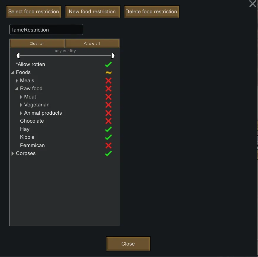 You have some huge stack of kibble, but your tamer is determined to use your potatoes that you would like to use to make lavish meal? This mod allows you to restrict in a general way which food your tamers will choose to tame or train animals!