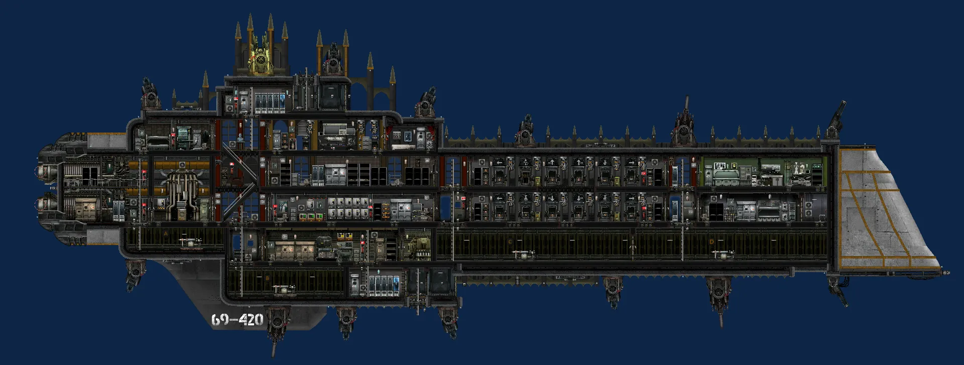 The Inquisitor-class Battleship is a fast and ponderous voidship that serves as one of the mainstay capital ships of the Navis Imperialis. The Emperor-class dispenses with the normal armoured prow of most Imperial battleships and instead carries a mass of sensor probes and forward turrets.