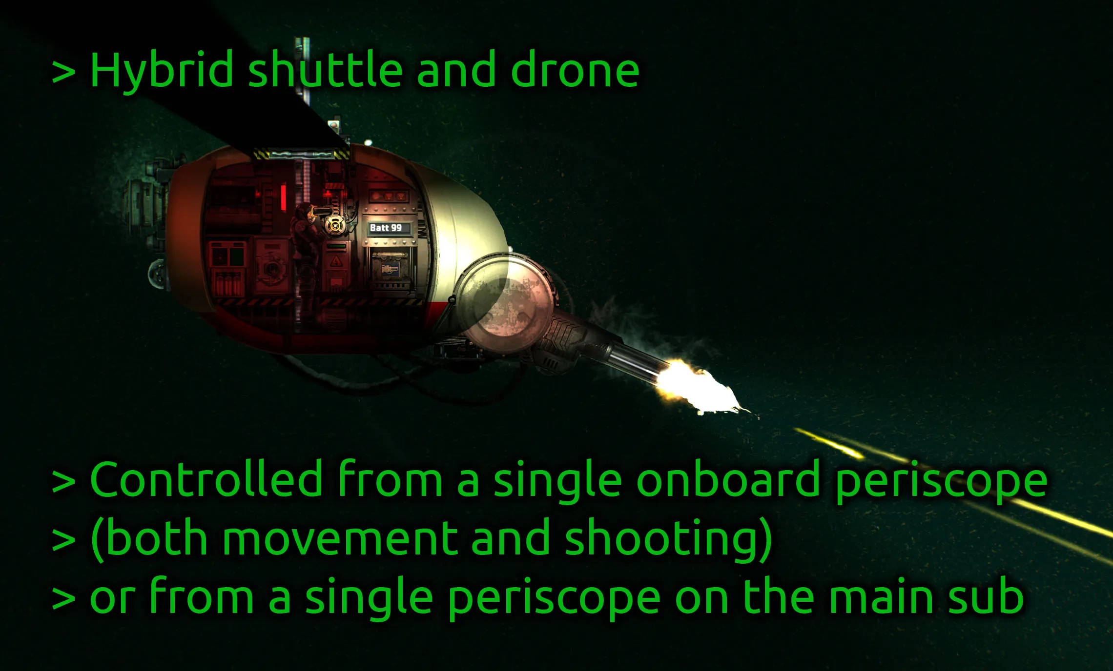 The Galdur Pod is both a shuttle and a drone (onboard or remote control). It's mainly intended to be added to other subs in the sub builder, but it's actually a lot of fun to drive around by itself on a mission! Or as a (very crowded) respawn shuttle. It's as easy to drive as a scooter, with great visibility all around.